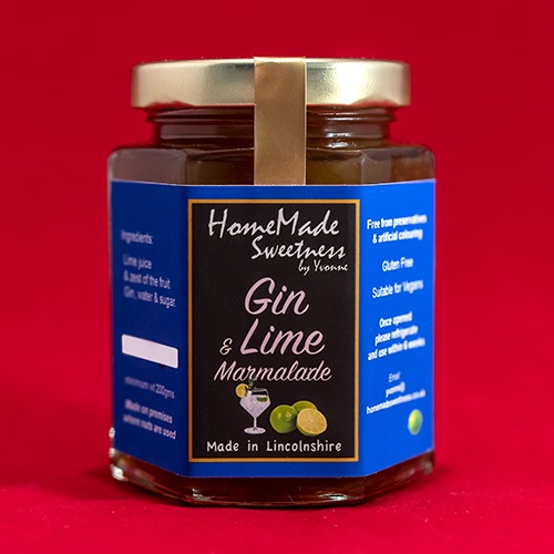 Made with Lime juice and zest, Gin, powdered pectin and sugar.
