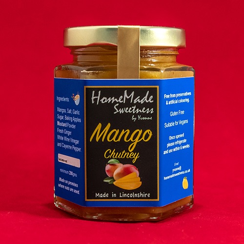 Mangos, Baking Apples, Fresh Ginger, Salt, Sugar, English Mustard Powder, White Wine Vinegar and Cyenne Pepper.