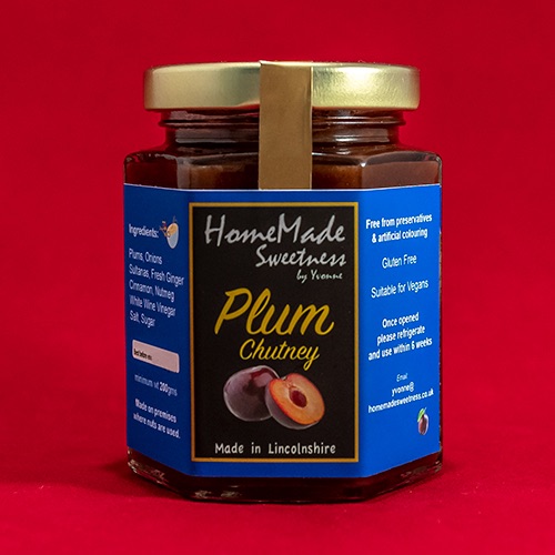 Plums, Onions, Sultanas, Fresh Ginger, Cinnamon, Nutmeg, Salt, White Wine Vinegar and sugar..